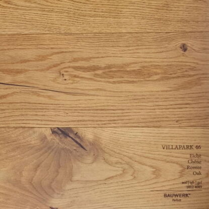 Durch den Architekten wurde eine Vorauswahl des Parketts getroffen. Diese beinhaltet eine Landhausdiele aus europäischer Eiche mit schlichter Sortierung, gebürstet und mit Fase zwischen den jeweiligen Riemen. Die Riemen werden versetzt verlegt.